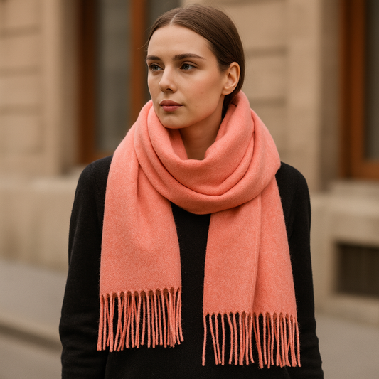Echarpe Cachemire Rose Pêche Veloutée et Franges Fines