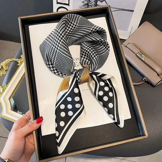 Carré 100% Soie Foulard noir et blanc tartan doré bordure pois blancs - carré de soie élégant