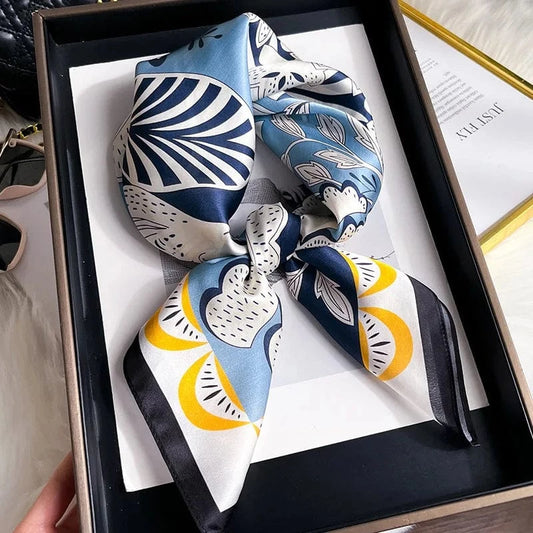 Carré 100% Soie Imprimé Floral et Géométrique Bleu Art Déco Moderne