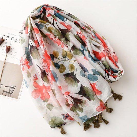 Foulard Bohème Floral Feuillage Vert et Blanc en Coton