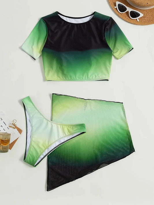 Ensemble Bikini avec Robe - Dégradé Élégant Noir-Vert pour un Look Tendance