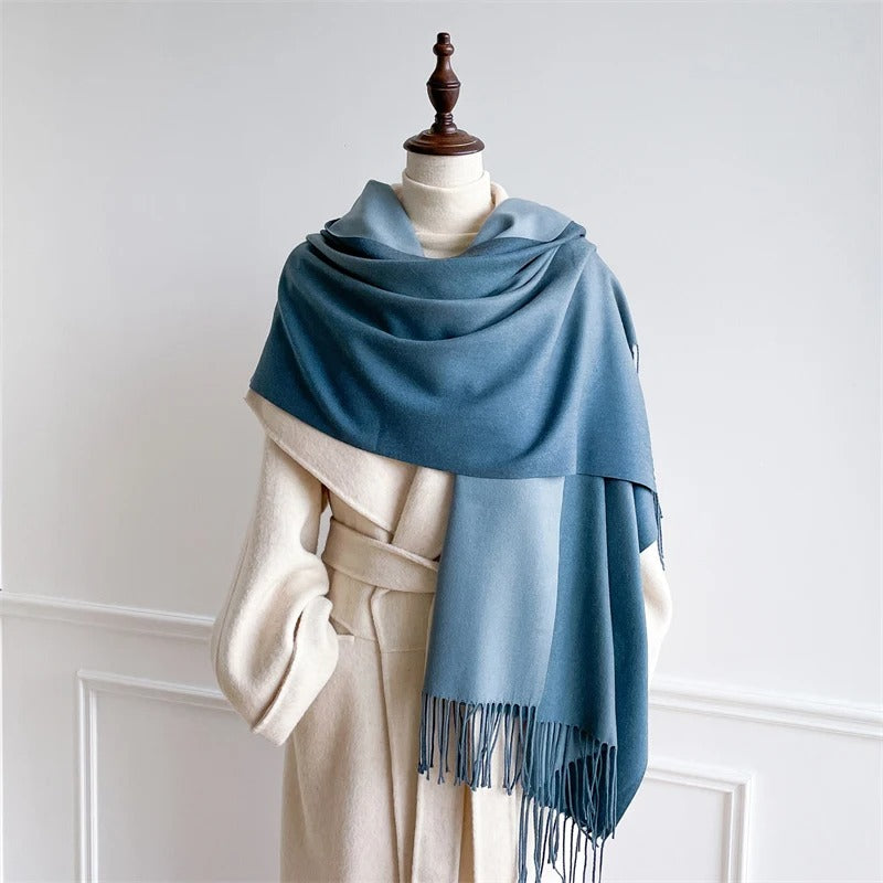 Echarpe Acrylique Bleu Dégradé 190x70 – Bleu Profond Vers Ciel, Satiné et Franges
