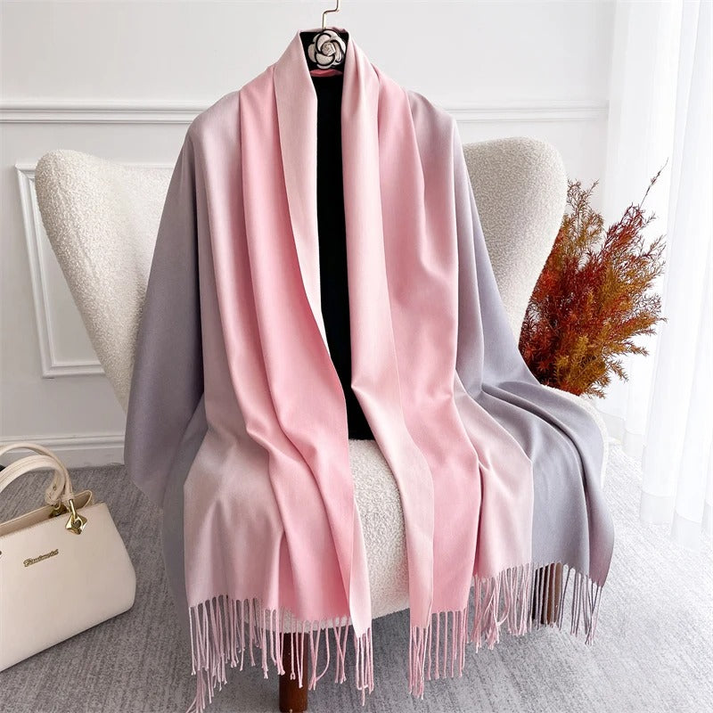 Écharpe Acrylique Dégradé Lilas Bleuâtre et Rose Poudré Pastel offre une allure moderne et romantique, avec un tombé fluide et des franges assorties en rose clair qui apportent une touche chic à toutes les tenues.