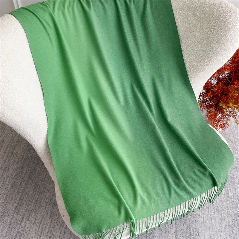 Découvrez cette écharpe rectangulaire en acrylique, uni et vibrant, parfaite pour apporter une touche de couleur à vos tenues. Drapée sur un fauteuil clair, elle révèle un vert émeraude intense, avec des nuances plus claires et plus foncées qui créent un dégradé délicat sous l’éclairage. Le fini lisse et légèrement satiné capte la lumière et ajoute de l’élégance à chaque mouvement. Les extrémités présentent des franges fines et régulières sur toute la largeur, pour une finition raffinée.